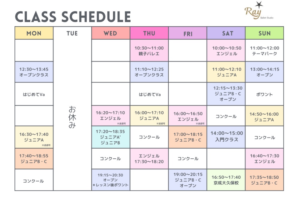 レッスン日 | [ジュニアA] ・月曜日 16:30〜17:40 ・水曜日 16:20〜17:35 ・木曜日 16:00〜17:10 ・土曜日 11:00〜12:10 ・日曜日 14:50〜16:00 [ジュニアB.C] ・月曜日 17:40〜18:55 ・水曜日 17:20〜18:35 ・木曜日 17:40〜18:55 ・金曜日 17:30〜18:45 ・土曜日 12:15〜13:30 ・日曜日 17:35〜18:50 |